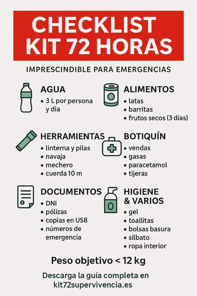 👉 Recuerda: un kit de 72 horas no es paranoia, es previsión. Tenerlo listo te da tranquilidad, te ahorra tiempo y puede incluso salvar vidas.